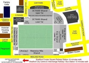 If you are going by train to Bradford Interchange, it is quite a walk to the ground (20 minutes). Either take a taxi (£6) or the bus station is located next to the train station (Bus No 622, 623, 626 or 662). Chris Hawkridge suggests that ‘supporters travelling via Leeds should catch the Leeds—Bradford Forster Square service (two trains per hour during the day) rather than those to Bradford Interchange. Forster Square is only a 10-minute walk from the ground.